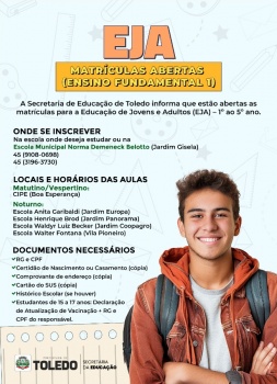 Entre em contato com Joslaine, coordenadora da EJA, na Secretaria da Educação de Toledo: (45) 3196-3533.