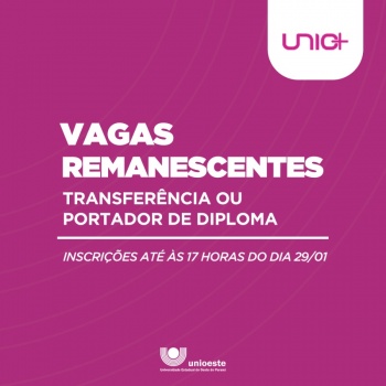 A Universidade Estadual do Oeste do Paraná - Unioeste - está com inscrições abertas para as vagas remanescentes em diversos cursos nos campi de Cascavel, Francisco Beltrão, Foz do Iguaçu, Marechal Cândido Rondon e Toledo. O prazo para inscrição vai até as 17h do dia 29 de janeiro.