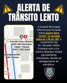 A Guarda Municipal (GM) de Toledo informou que, na tarde desta quarta-feira (12), o cruzamento da Avenida Senador Attílio Fontana com a Avenida Carlos Sbaraini estará parcialmente interditado entre as 13h00 e 18h00.