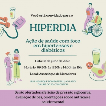 Será realizada nesta sexta-feira (18), na Associação de Moradores do Jardim Concórdia, o “Hiperdia”, uma ação de saúde voltada a pessoas com hipertensão e diabetes. O evento será promovido pela equipe da Unidade Básica de Saúde (UBS) Jardim Concórdia, e será realizado em dois períodos: das 9h30 às 11h30 e das 14h às 16h, com oferta de diversos serviços gratuitos à população.