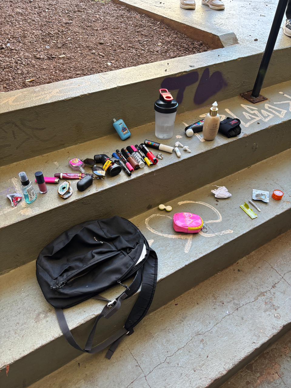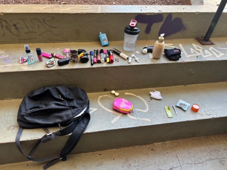Durante a revista, os agentes encontraram na bolsa da jovem uma porção de substância análoga à maconha, além de canetas, canetões, tinta, maquiagem e outros materiais utilizados na pichação.