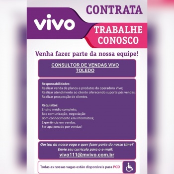 A Loja Vivo de Toledo está com uma oportunidade de emprego aberta para o cargo de Consultor de Vendas. O profissional será responsável por realizar a venda de planos e produtos da operadora Vivo, oferecer suporte pós-vendas aos clientes e realizar a prospecção de novos clientes.