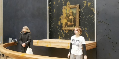Num vídeo publicado nas redes sociais, duas mulheres com as palavras Food Riposte (Resposta Alimentar) escritas nas suas camisetas são vistas passando por baixo de uma barreira de segurança para se aproximarem do quadro e atirar sopa ao vidro que protege a obra-prima de Leonardo da Vinci.