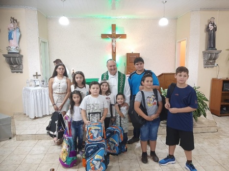 Estudantes de todas as idades são convidados a levar as suas mochilas para receber a bênção especial do pároco, padre Laudemir da Rocha.