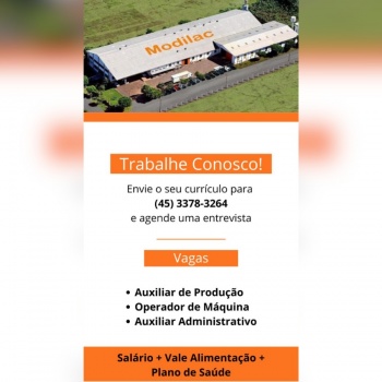 A Modilac Indústria e Comércio de Móveis, empresa localizada em Toledo, está com três vagas abertas em seu quadro de colaboradores. As oportunidades são para Auxiliar Administrativo, Operador de Máquinas e Auxiliar de Produção. Todas as vagas oferecem salário compatível com a função, vale-alimentação e plano de saúde.