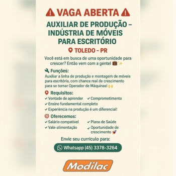 A Modilac Indústria e Comércio de Móveis, localizada em Toledo, está com vaga aberta para Auxiliar de Produção. A oportunidade é ideal para quem busca ingressar no setor industrial, com foco na linha de produção e montagem de móveis para escritório. A empresa oferece chances reais de crescimento, com possibilidade de desenvolvimento para a função de Operador de Máquinas.
