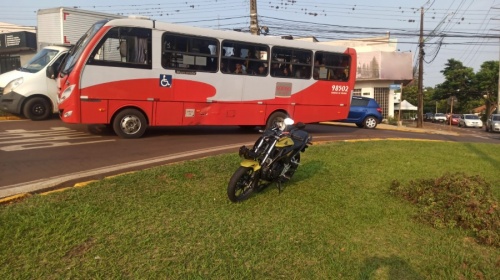 Um acidente envolvendo um ônibus e uma motocicleta foi registrado na rotatória da Rua dos Pioneiros com a Avenida Senador Attílio Fontana, no Jardim Bressan, por volta das 07h30 desta terça-feira (15).