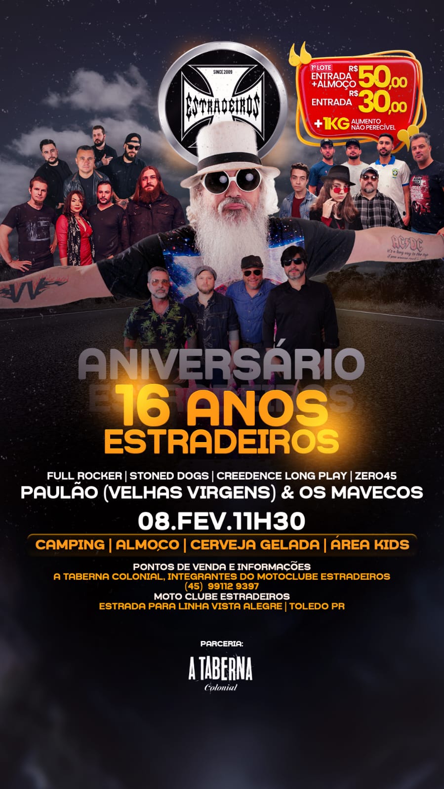 O Moto Clube Estradeiros está preparando uma grande celebração para marcar o seu aniversário de 16 anos. O evento será realizado neste sábado, dia 08 de fevereiro, a partir das 11h30, e promete reunir amantes do motociclismo e do rock em um dia repleto de música, confraternização e diversão.