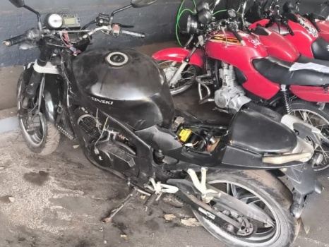 A equipe policial encontrou o portão de uma oficina aberto e, após adentrar o local, localizou uma motocicleta Kasinski, de cor preta, com a placa adulterada. A moto usava a placa de uma Kawasaki, de cor preta.