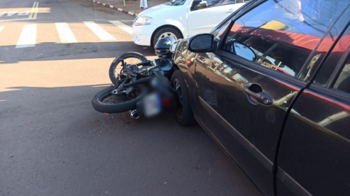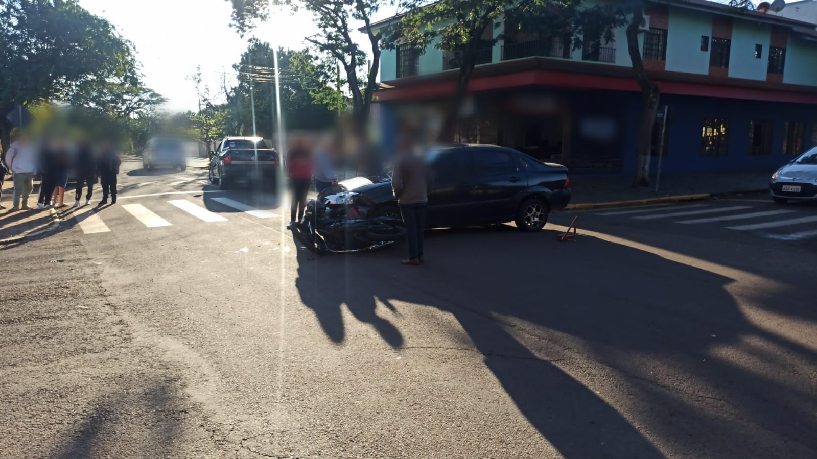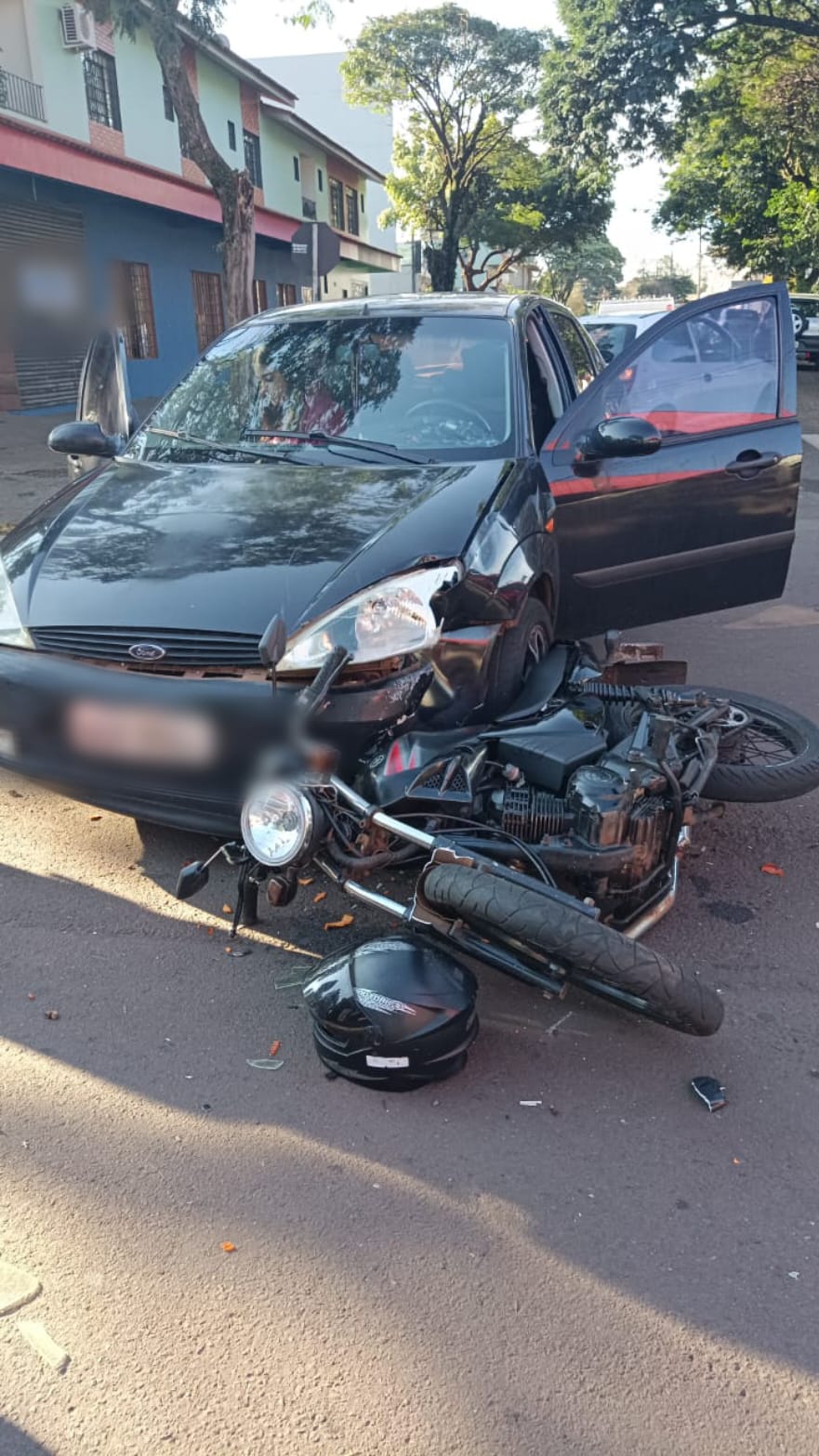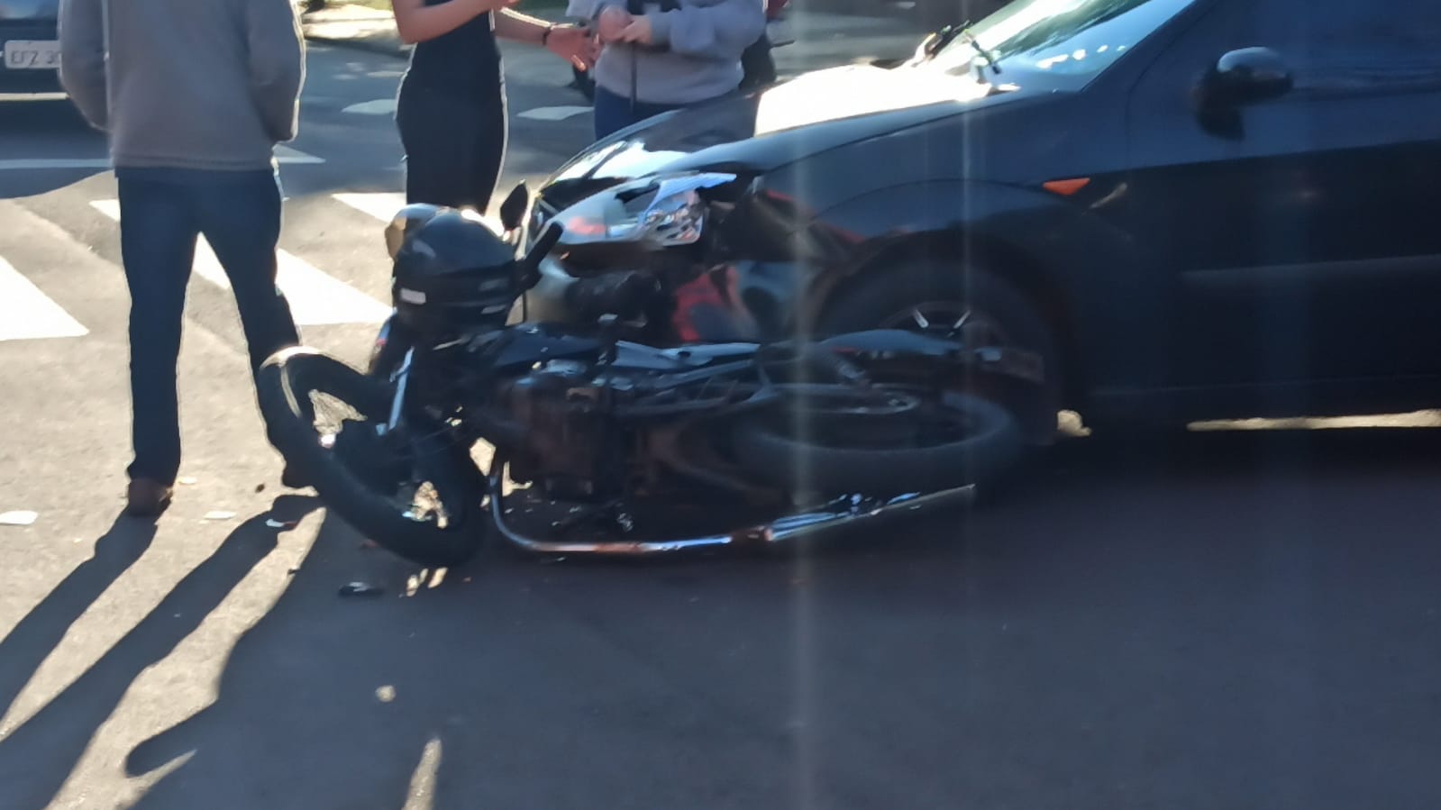 Uma motocicleta foi parar embaixo de um veículo após um acidente registrado no meio da tarde desta sexta-feira (23), no cruzamento das ruas Paraná e Cerro Largo, no Jardim Porto Alegre, em Toledo. A colisão envolveu uma motocicleta Yamaha 125, de cor preta e um veículo Ford Focus, também de cor preta.