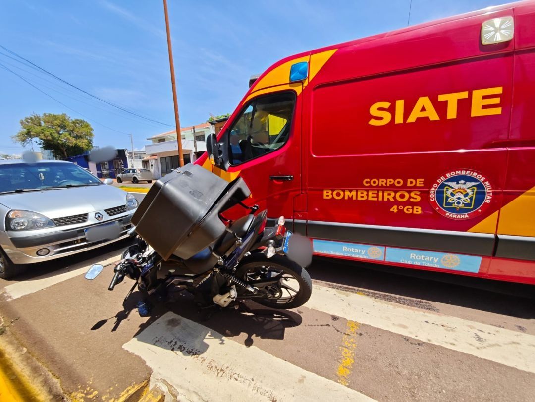 Um acidente de trânsito foi registrado na Rua 1º de Maio, no cruzamento com a Rua Piratini, na Vila Pioneiro, em Toledo, envolvendo um automóvel Fiat Argo e uma motocicleta Honda CG 160 Titan. A colisão deixou um motociclista de 26 anos ferido.
