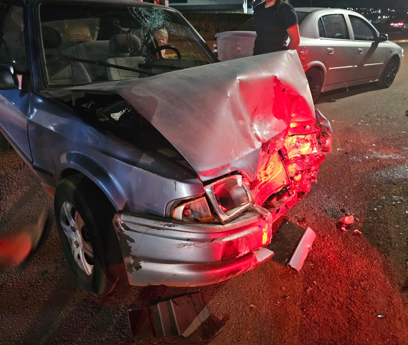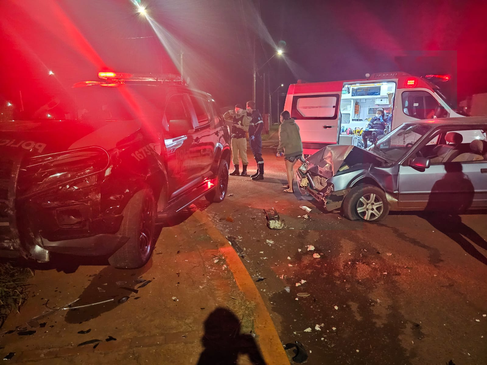 No sentido oposto seguia um veículo Escort, cujo motorista, ao se deparar com a moto vindo em alta velocidade em sua direção, tentou desviar para evitar uma colisão frontal. No entanto, ao também invadir a contramão, o Escort acabou colidindo diretamente com a viatura policial.