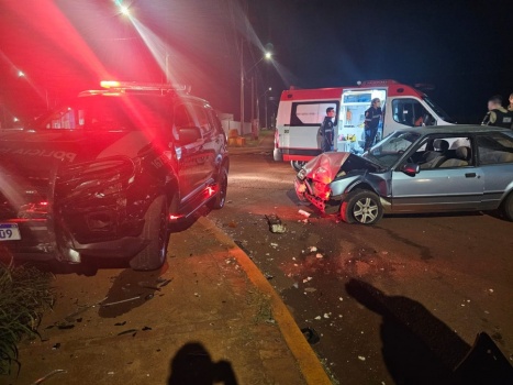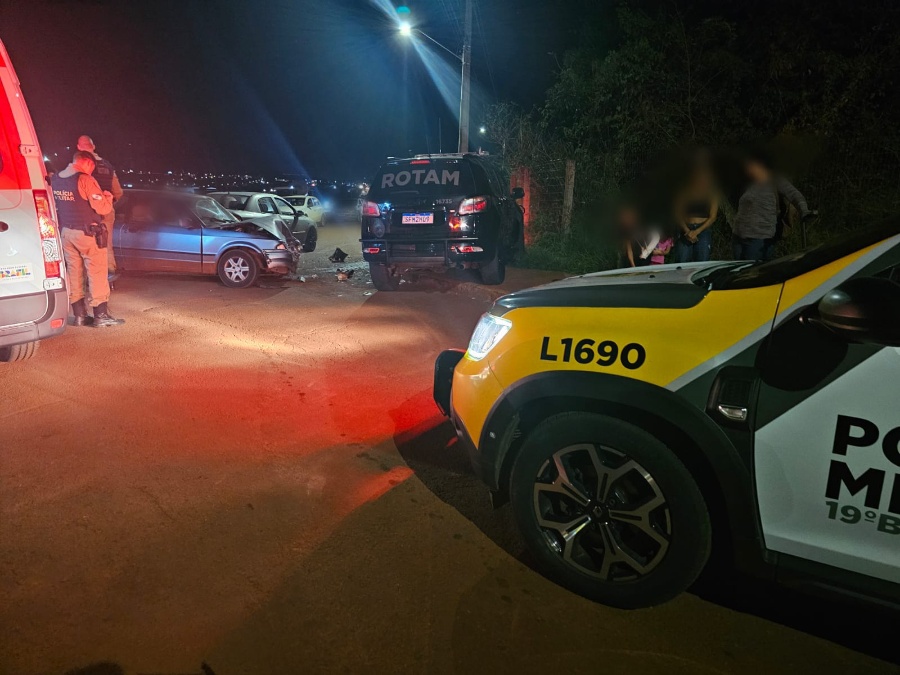 Um motociclista em fuga provocou um acidente envolvendo uma viatura da Rondas Ostensivas Tático Móvel (Rotam) e um Ford Escort. A situação ocorreu no início da noite desta quinta-feira (15), no cruzamento das ruas Domingos Miotto e Marginal Donassolo, no Jardim da Mata, em Toledo.