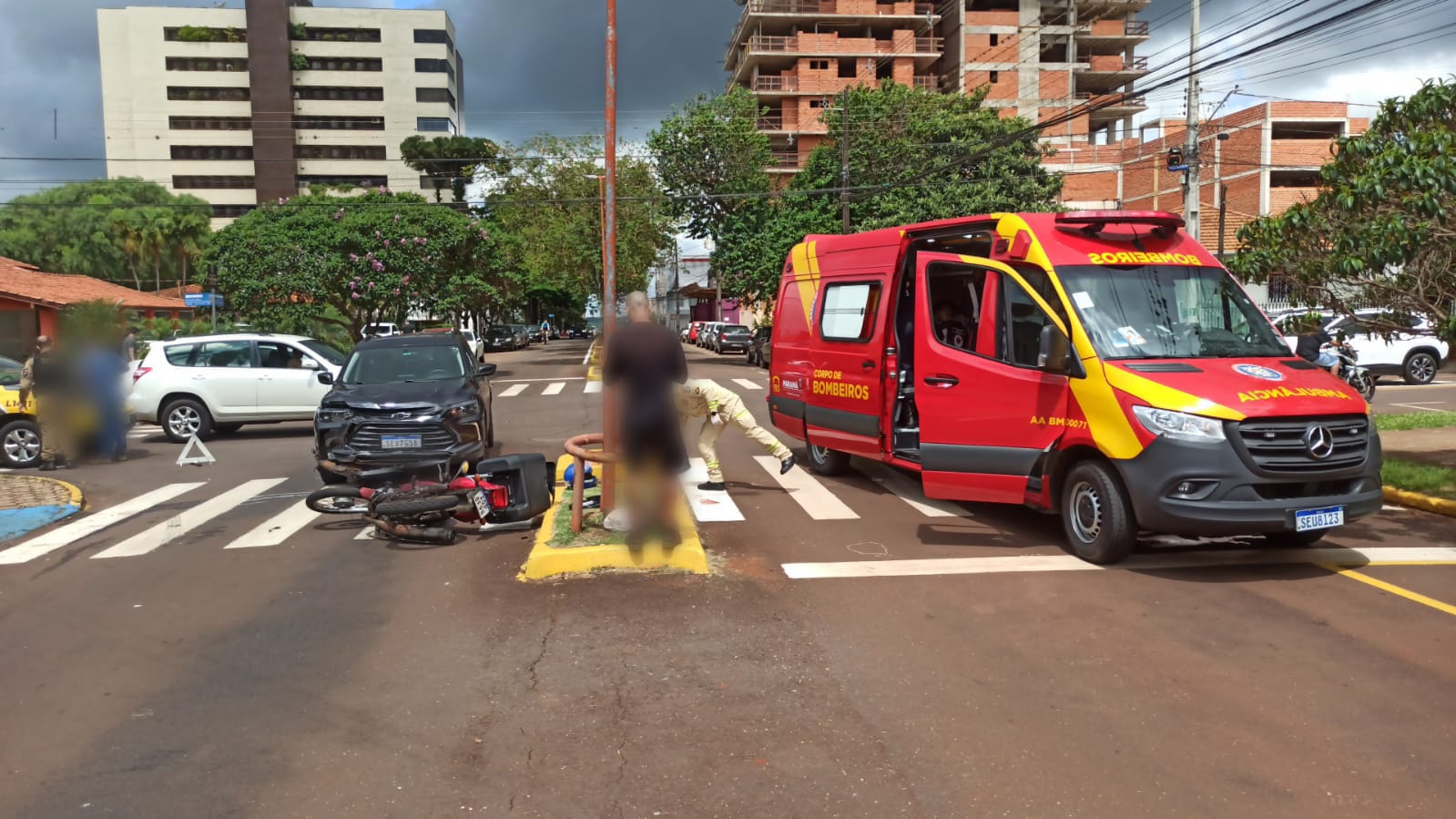 Um motociclista resultou com ferimentos graves após um acidente de trânsito ocorrido na tarde desta quarta-feira, 06, no cruzamento da Rua 15 de Novembro com a Rua Independência, centro de Toledo.
