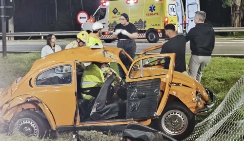 Um grave acidente envolvendo um Fusca deixou dois amigos feridos na madrugada deste sábado (15), na BR-277, no bairro Orleans, em Curitiba. O veículo capotou e foi arremessado contra a cerca metálica que divide as pistas, destruindo parte da estrutura. O motorista ficou preso às ferragens, enquanto o passageiro foi ejetado do carro com o impacto.