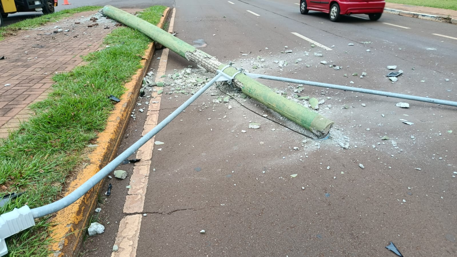 O veículo trafegava pela via quando o motorista perdeu o controle da direção, atravessou o canteiro central e atingiu um poste. O impacto foi suficiente para derrubar a estrutura.