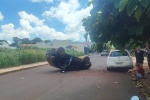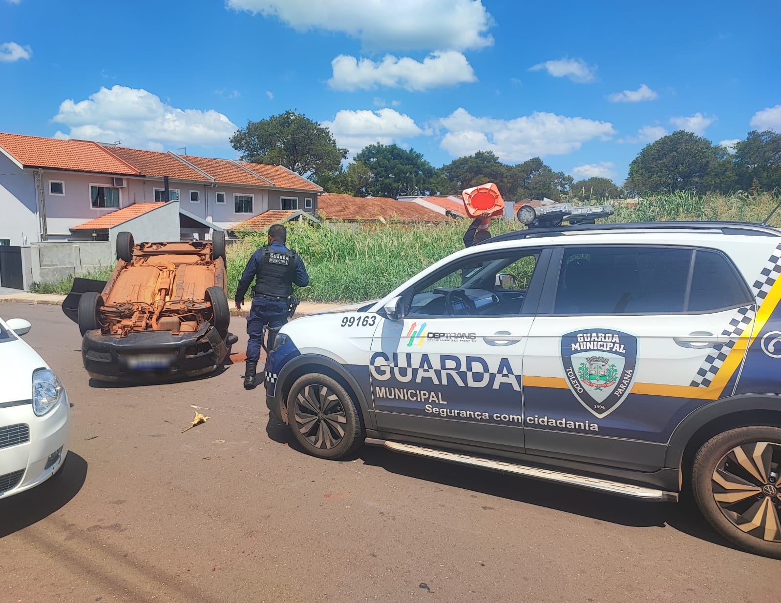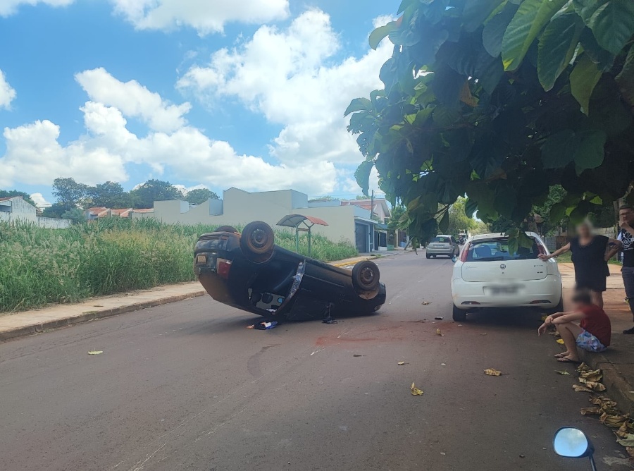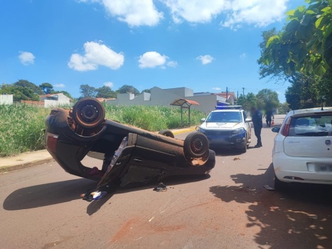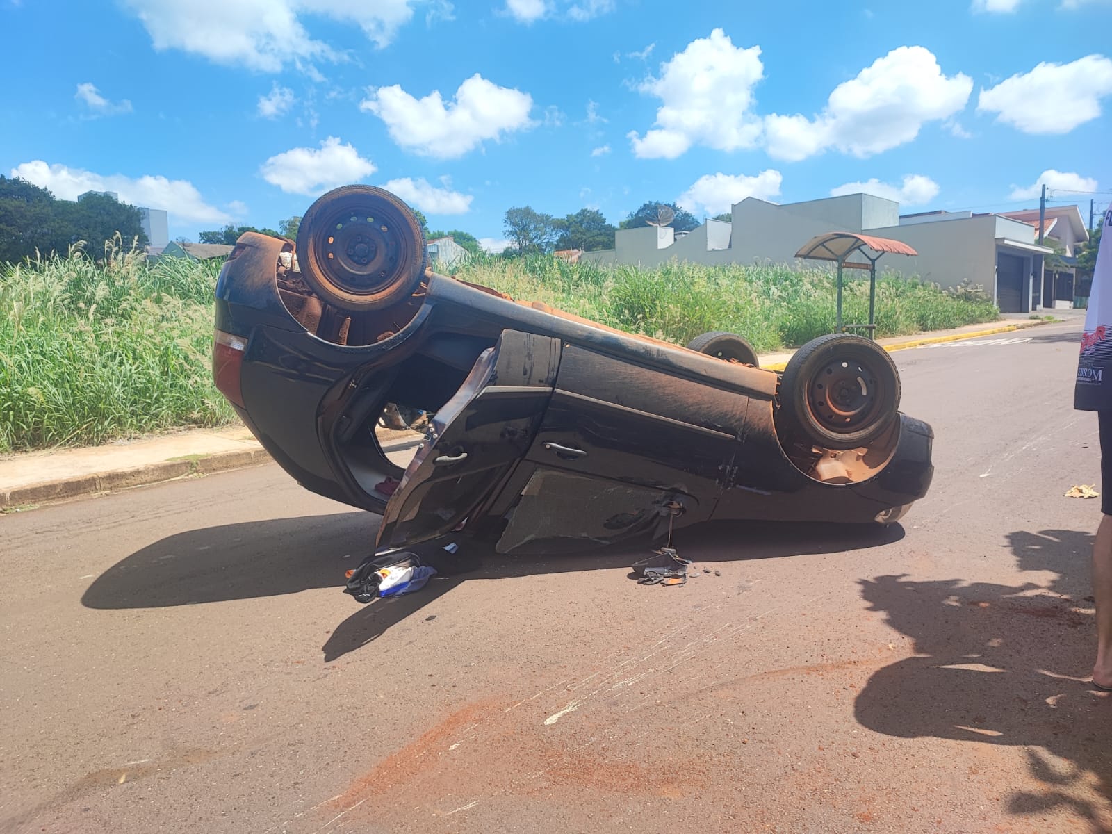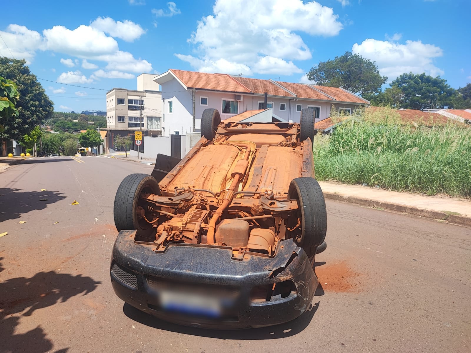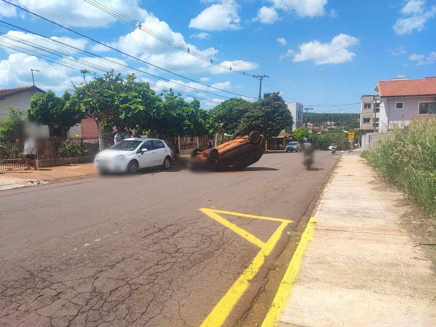 Um veículo Fiat Palio, de cor preta, capotou no final da manhã desta quarta-feira (05), na Rua Garibaldi, na Vila Paulista, em Toledo.
