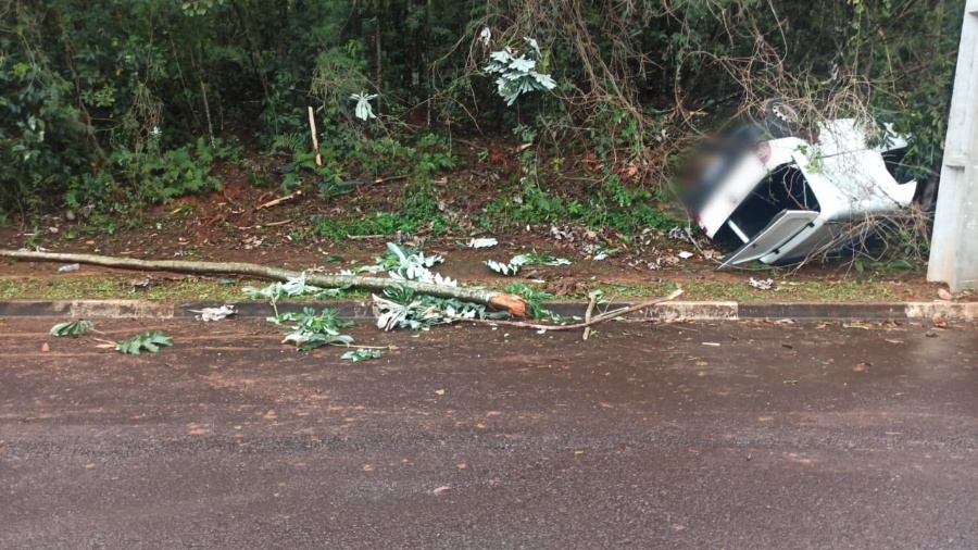 Motorista perde o controle da direção em curva, derruba árvore e capota veículo na Rua Alemanha