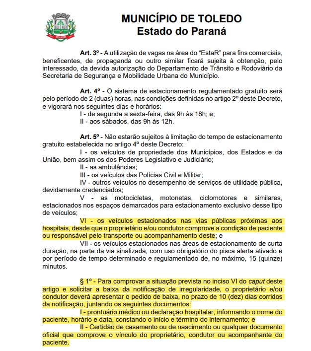 O Decreto Municipal de Nº 839, de 26 de junho de 2023, que regulamenta o sistema de estacionamento na cidade, dispõe sobre o estacionamento gratuito nas vias públicas próximas aos hospitais (em específico no Artigo 5º, Inciso VI) a isenção da limitação de tempo para veículos em situações de emergência, desde que o motorista seja paciente ou responsável pelo transporte de um paciente.