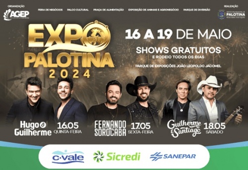 A equipe da Associação Gestora da Expo Palotina (AGEP) trabalha em ritmo acelerado para deixar o Parque de Exposições impecável para receber o público de Palotina e região. No dia da abertura, na quinta-feira (16), a dupla Hugo e Guilherme vai agitar a festa da galera no palco principal do evento. Na sexta-feira (17), a dupla sertaneja Fernando e Sorocaba promete agitar o público com suas músicas empolgantes e no sábado, dia 18, o show ficará por conta da dupla Guilherme e Santiago.
