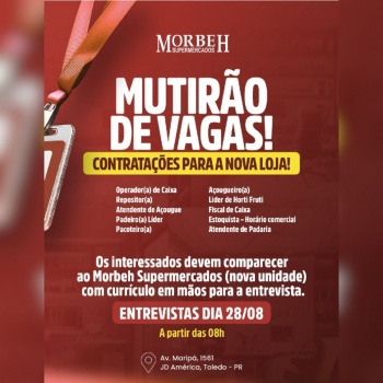 As entrevistas serão realizadas no dia 28 de agosto, a partir das 08h00, na nova unidade do Morbeh Supermercados, localizada na Avenida Maripá, Nº 1.561, no Jardim América.