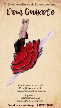 O Núcleo Acadêmico de Dança (NAD) apresentará o espetáculo de ballet Dom Quixote no Teatro Municipal de Toledo nos dias 09 e 10 de novembro. Inspirada no clássico romance espanhol Don Quixote de La Mancha, de Miguel de Cervantes, a montagem terá trilha de Ludwig Minkus e coreografia original de Marius Petipá, reconhecida por sua energia vibrante e coreografias exuberantes.