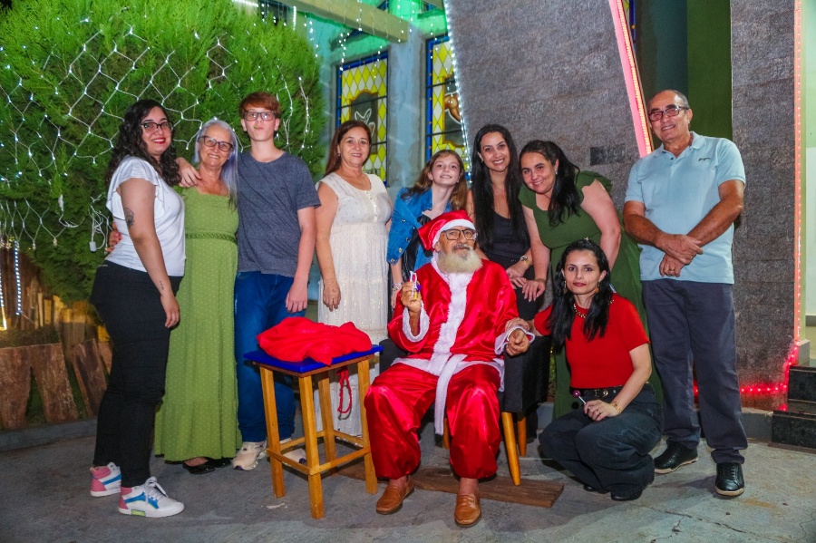 Após a missa, a celebração continuou com a chegada especial do Papai Noel, que distribuiu balas para as crianças, espalhando alegria e completando a noite com um toque de magia natalina.