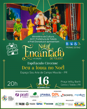Encaminhando-se às últimas semanas da VII Edição do Natal Encantado de Toledo, na segunda-feira, dia 16 de dezembro, o público da Vila de Natal na Praça Willy Barth vai poder conferir de perto o Espetáculo Circense Deu a Louca no Noel, apresentada pelo grupo Espaço Sou Arte de Campo Mourão. A atração gratuita será às 20h.