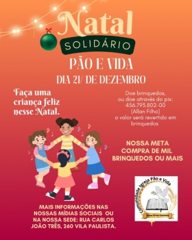 A Comunidade Igreja Pão e Vida realizará no dia 21 de dezembro a edição 2024 do Natal Solidário "Pão e Vida". O evento, que ocorre desde 2013, busca levar alegria para crianças carentes por meio da entrega de brinquedos e uma grande confraternização gratuita. A igreja, localizada na Rua Carlos João Treis, Nº 260, na Vila Paulista, convida toda a comunidade a participar da ação solidária.