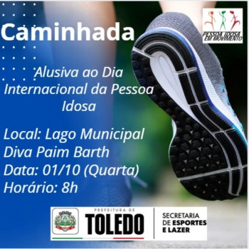 A Prefeitura de Toledo, por meio da Secretaria de Esportes e Lazer (Smel), promove nesta quarta-feira (1º) uma caminhada em comemoração ao Dia Internacional da Pessoa Idosa. A atividade faz parte do programa “Pessoa Idosa em Movimento” e será realizada no Parque Ecológico Diva Paim Barth, com início às 8h. O evento é gratuito e aberto a pessoas de todas as idades