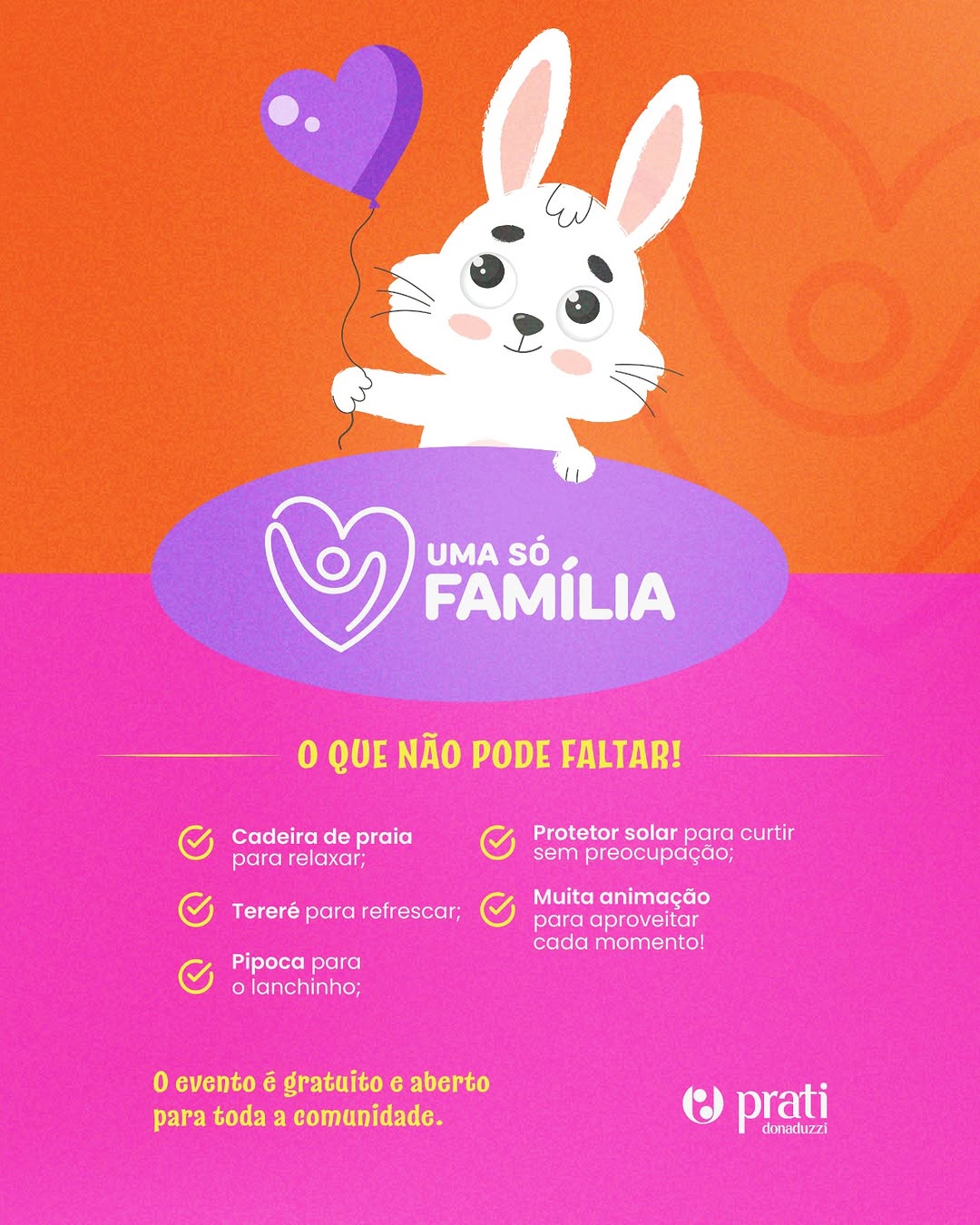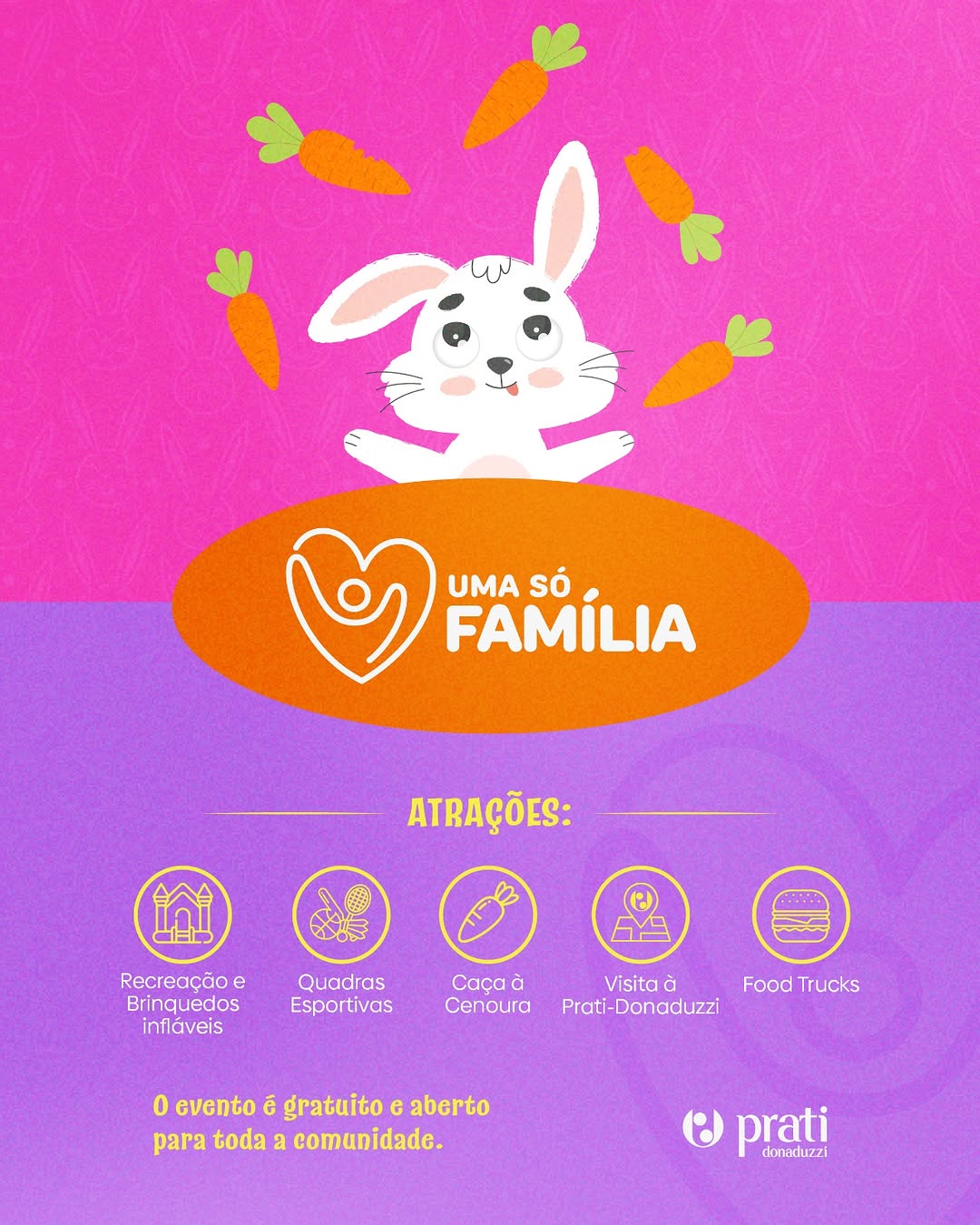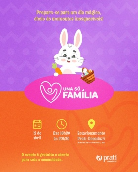 A Prati-Donaduzzi promove neste sábado, dia 12 de abril, mais uma edição especial do projeto Uma Só Família, com uma programação voltada para celebrar a Páscoa de forma alegre, segura e integrada entre colaboradores, famílias e a comunidade de Toledo. O evento será realizado das 16h30 às 20h30, no estacionamento da indústria, com entrada gratuita.