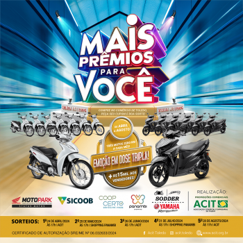 A promoção ‘Mais Prêmios para Você’ é uma realização da ACIT, através do Fundo Direto de Promoções, com parceria do Sicoob Meridional, Cartões Coopcerto, Shopping Panambi, Sodder Motos e Náutica – Concessionária Yamaha e Motopark Honda Toledo – Concessionária Honda.