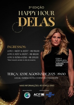 Proporcionar um espaço de conexão, fortalecimento e desenvolvimento para mulheres que empreendem é o principal objetivo do Happy Hour Delas. Promovido pelo Núcleo da Mulher Empresária de Toledo da Associação Comercial e Empresarial (ACIT), a terceira edição do evento acontece no dia 12 de agosto, às 19h00, no Olinda Hotel e Eventos de Toledo.