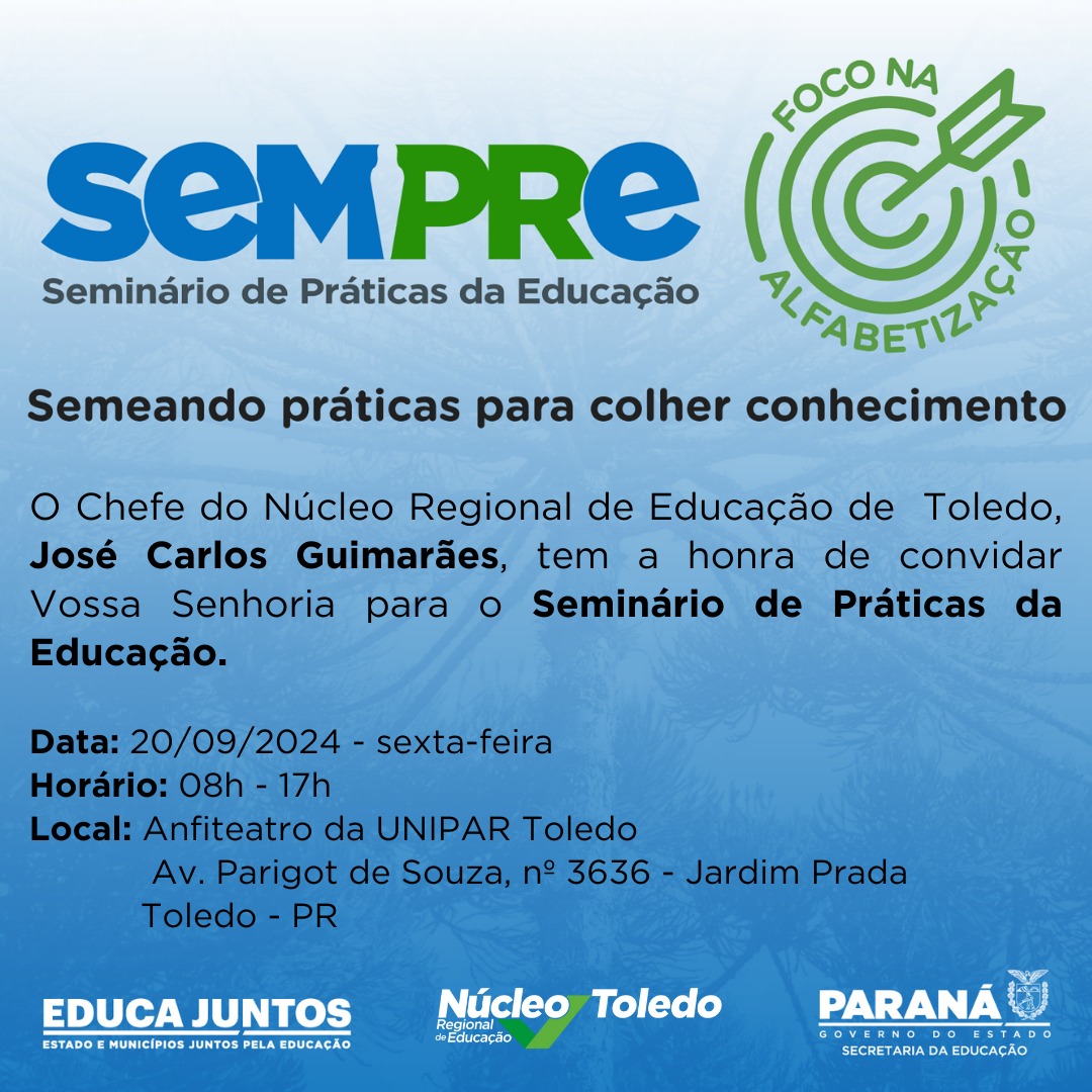 O seminário será realizado no Anfiteatro da Universidade Paranaense (Unipar) - Campus I - Toledo, localizado na Avenida Parigot de Souza, Nº 3.636, no Jardim Prada, das 08h00 às 17h00. A programação contará com a participação de prefeitos, secretários municipais de educação, diretores de escolas, professores, formadores e cursistas, que compartilharão experiências e práticas bem-sucedidas na educação.