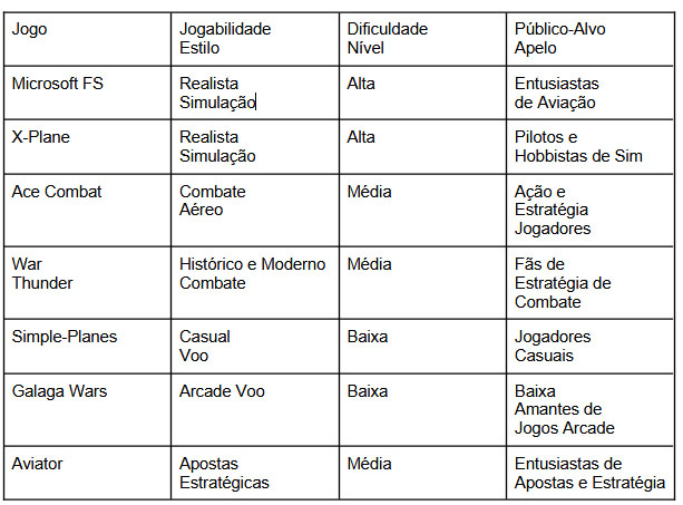 A tabela acima destaca os recursos distintos, níveis de complexidade e públicos-alvo de vários jogos de aviação. O Aviator se destaca com sua combinação única de apostas estratégicas e temas de aviação, tornando-o atraente para um nicho de público.