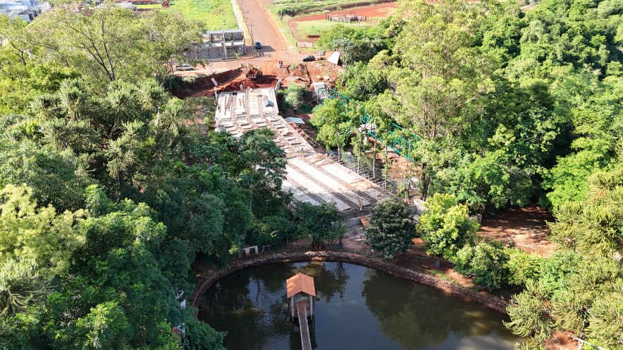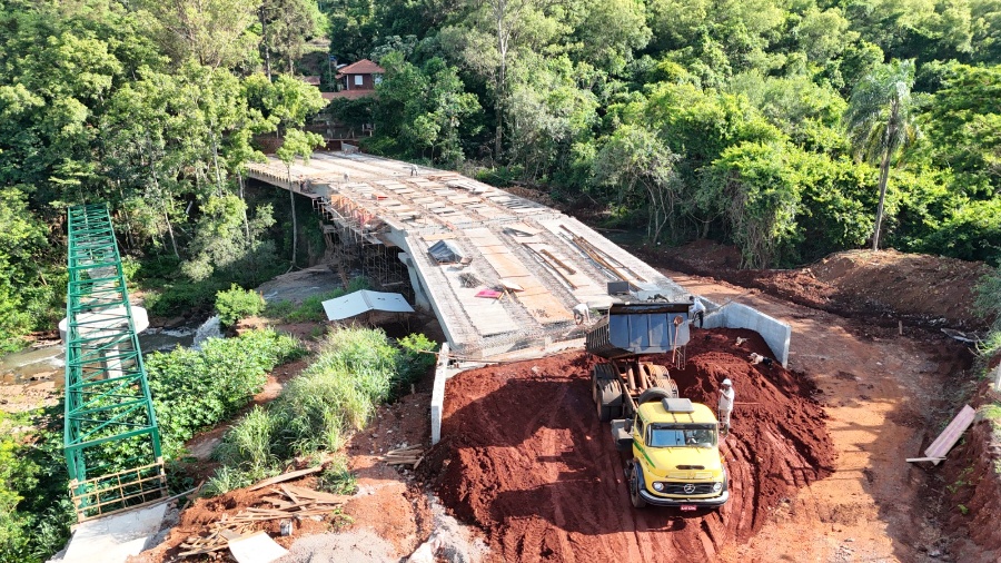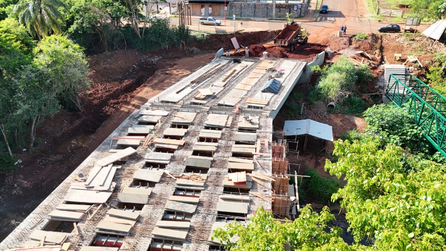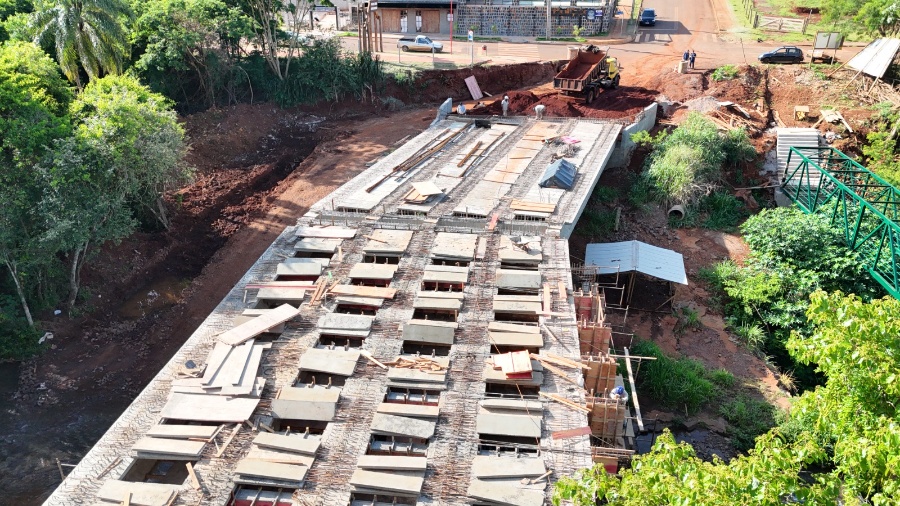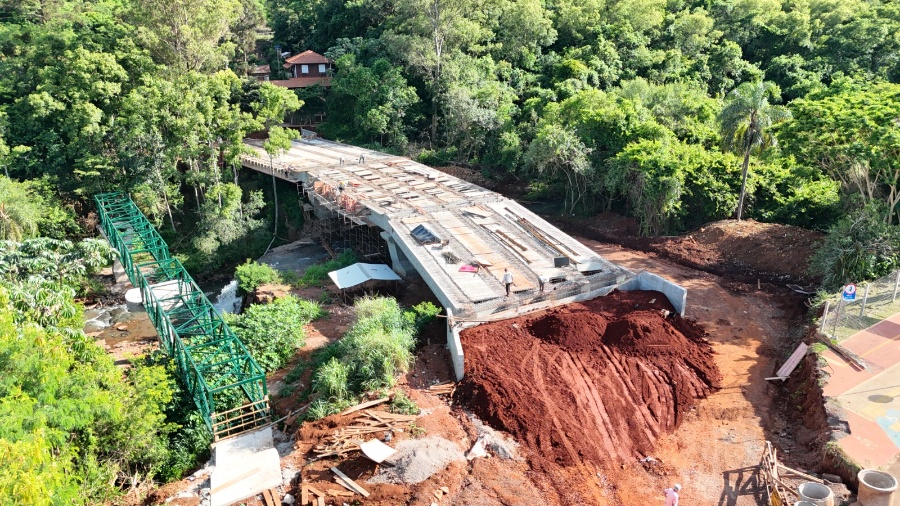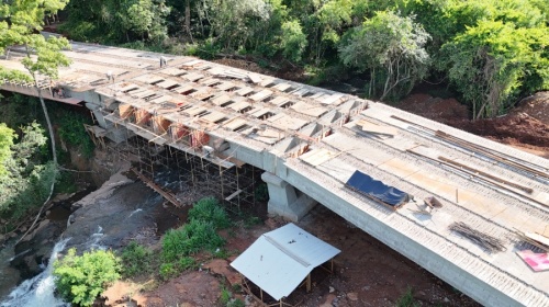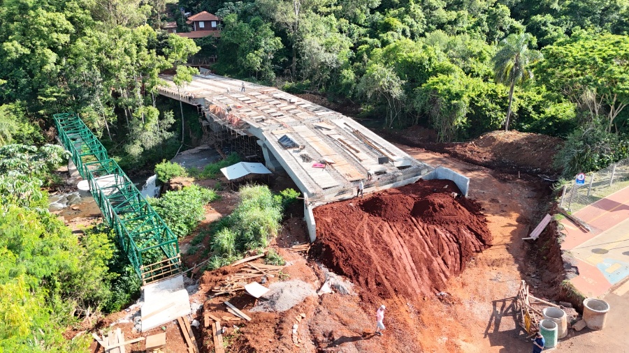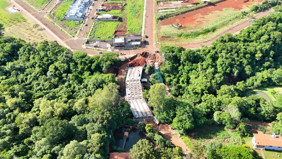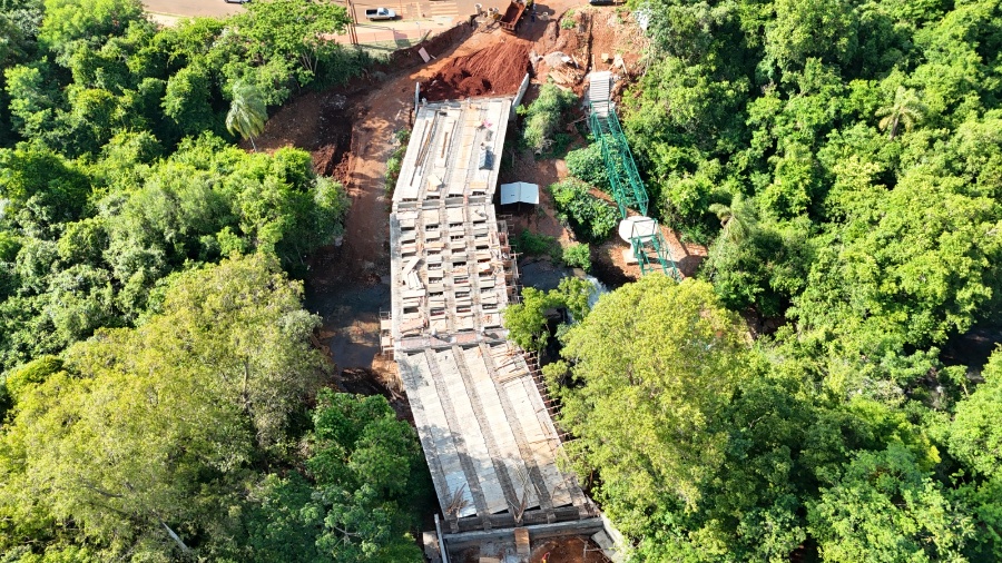 As obras da Ponte do Rio Marreco, na Rua Ângela Zanella, estão 90,00% concluídas e devem ser entregues entre janeiro e fevereiro de 2025. Restam apenas a execução da laje e a ligação da estrutura com as ruas do entorno.