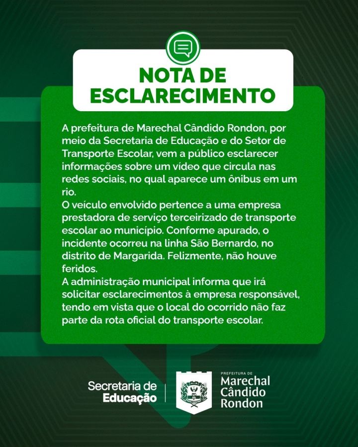 Achei IPhoneDiante da situação, a Prefeitura de Marechal Cândido Rondon se manifestou por meio de nota oficial divulgada pela Secretaria de Educação e pelo Setor de Transporte Escolar. No comunicado, o Município confirmou que o ônibus pertence a uma empresa terceirizada responsável pelo transporte escolar.
