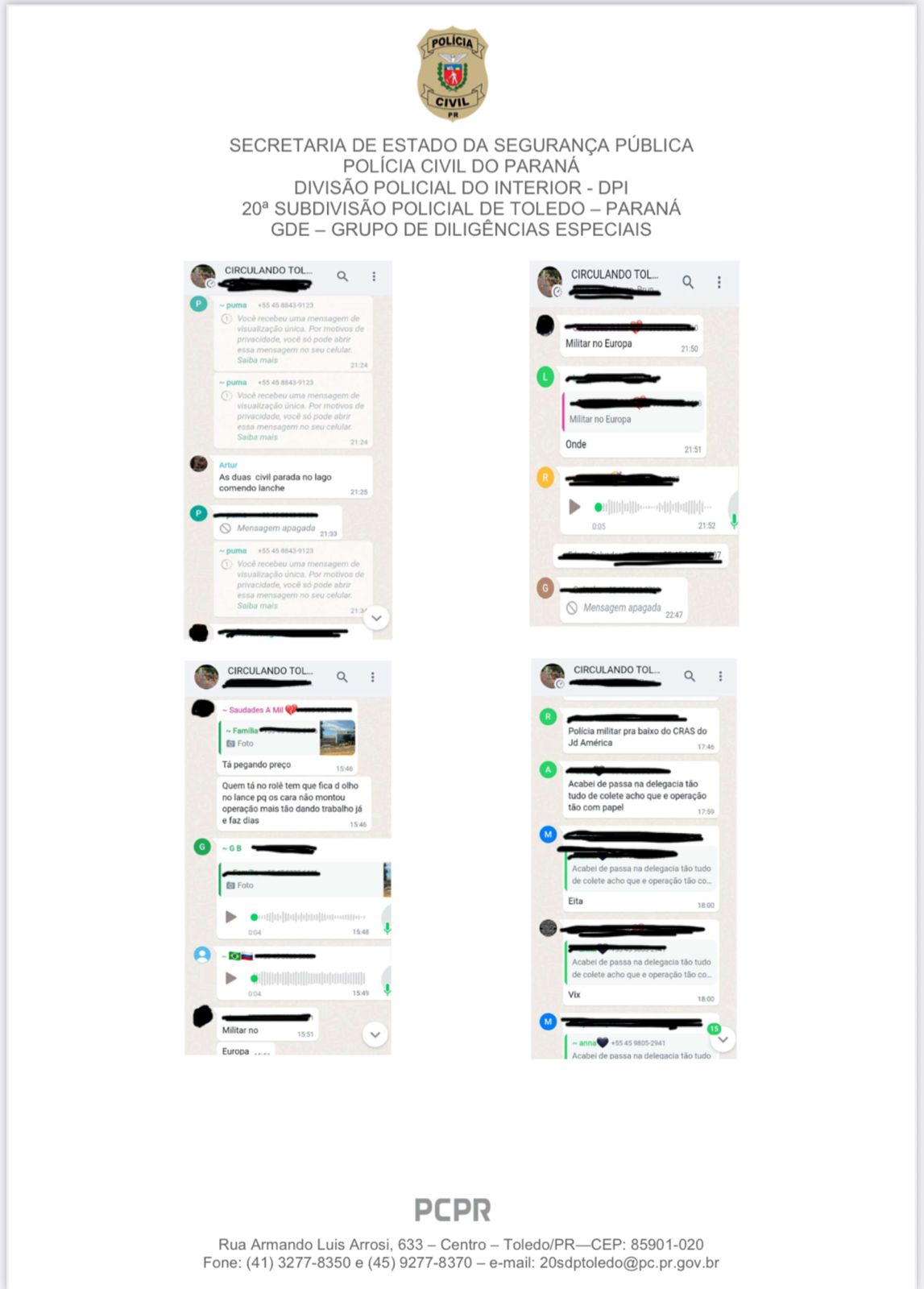 Os alvos são apontados como administradores de grupos em aplicativos de mensagens que tinham como finalidade o monitoramento da rotina das forças de segurança pública, em especial da Polícia Civil (PC) e da Polícia Militar (PM), no município de Toledo. O grupo, com mais de 600 integrantes, era utilizado para compartilhar em tempo real informações sobre ações policiais, muitas vezes frustrando diligências, operações e prejudicando serviços de interesse público.