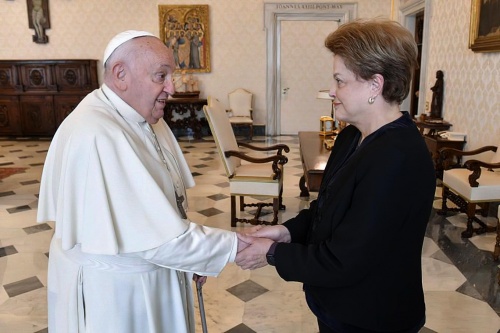 O papa Francisco recebeu neste sábado, no Vaticano, a ex-presidenta Dilma Rousseff, atual presidenta do Novo Banco de Desenvolvimento, também conhecido como Banco do Brics.
