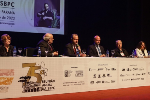 Autoridades do Governo do Paraná participaram neste domingo (23) da abertura da 75ª Reunião Anual da Sociedade Brasileira para o Progresso da Ciência (SBPC), no Teatro Guaíra, em Curitiba. A solenidade contou com a participação da ministra da Ciência, Tecnologia e Inovação, Luciana Santos; do secretário da Ciência, Tecnologia e Ensino Superior, Aldo Bona; do secretário da Inovação, Modernização e Transformação Digital, Marcelo Rangel; do presidente da SBPC, Renato Janine Ribeiro; do presidente da Fundação Araucária, Ramiro Wahrhaftig; do reitor da Universidade Federal do Paraná (UFPR), Ricardo Marcelo Fonseca, do prefeito de Curitiba, Rafael Greca, entre outras autoridades.