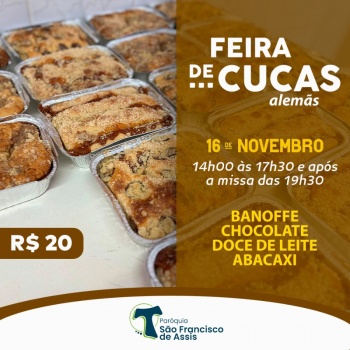A Paróquia São Francisco de Assis, localizada no Jardim Coopagro, em Toledo, convida toda a comunidade para a tradicional Feira de Cucas Alemãs, que será realizada no dia 16 de novembro. O evento ocorrerá das 14h00 às 17h30, com continuidade após a missa das 19h30.
