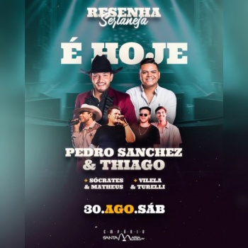 Hoje, 30 de agosto, o Empório Santa Maria, em Toledo recebe a verdadeira Resenha Sertaneja. O público poderá curtir shows de Pedro Sanchez & Thiago, Vilela & Turelli e Sócrates & Matheus, em uma noite que promete começar com grandes sucessos e muita animação.