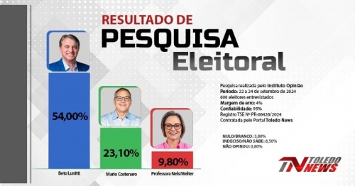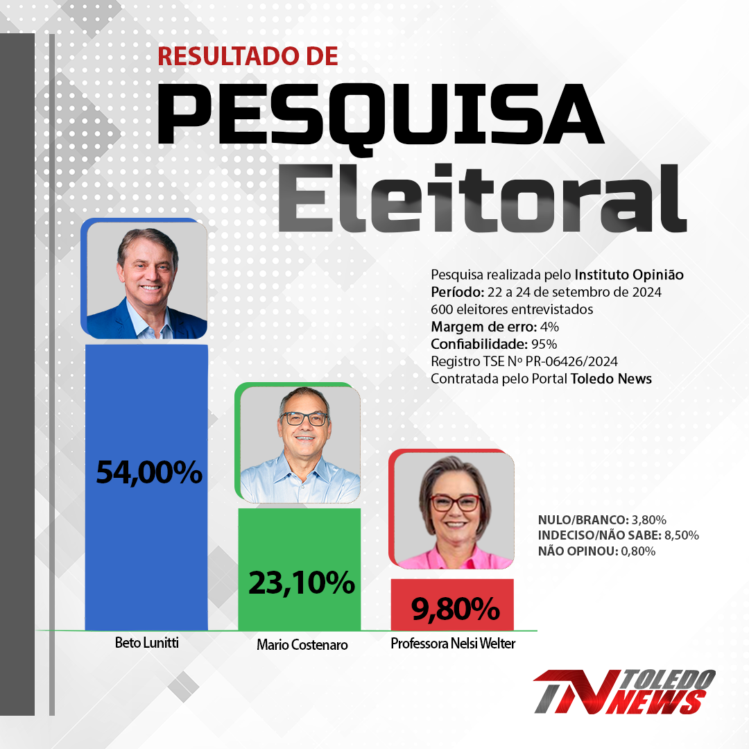 A pesquisa eleitoral contratada pelo Portal Toledo News junto ao Instituto Opinião, aponta o atual prefeito e candidato à reeleição, Luis Adalberto Beto Lunitti Pagnussatt (PSD), com vantagem na liderança da corrida eleitoral em nosso município com 54,00% das intenções de voto.
