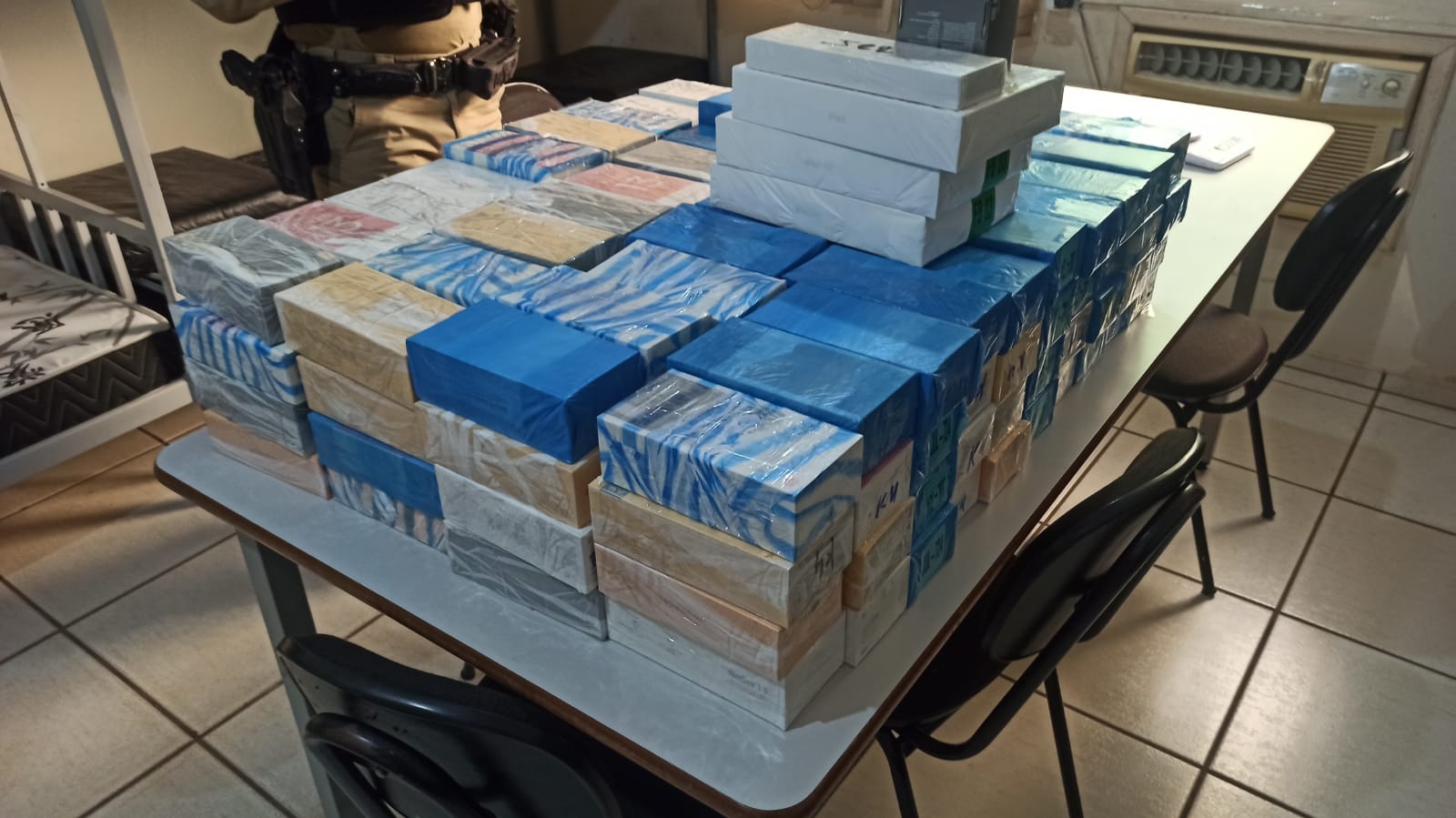 No Onix, abordado no trevo da rodovia PR-585 com a Rua Carlos Sbaraini, foram encontrados aproximadamente 140 celulares de diversas marcas e modelos.