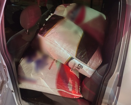 A equipe realizava patrulhamento pela Avenida Maripá, próximo à saída para o distrito de Concórdia do Oeste, quando avistou uma caminhonete GM S10 carregada com sacos de ração. Na abordagem, foram identificados o condutor e a passageira. Durante a revista, foram encontrados mais cinco sacos no banco traseiro.