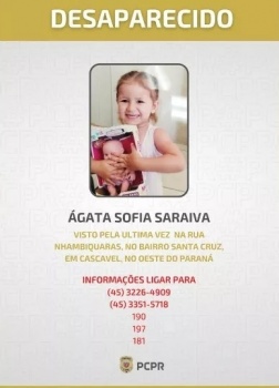 Informações sobre a menina Agatha Sofia Saraiva podem ser repassadas para a Polícia Civil pelos telefones: (45) 3301-5718, (45) 3226-4909, pelo 181 e 197.