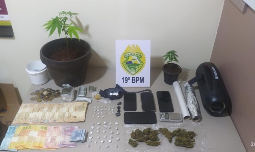Na busca domiciliar, foram apreendidas 28 pedras grandes de crack, 21 pedras pequenas de crack, uma porção bruta de crack, quatro buchas de cocaína, uma porção grande de cocaína, três porções de maconha, um tablete de maconha, uma porção de murruga e duas plantas de cannabis. Além disso, foram apreendidos R$ 1.608,00 em dinheiro e diversos equipamentos eletrônicos, como dois videogames e uma caixa de som.