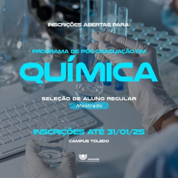 Estão abertas as inscrições para seleção de alunos regulares no Programa de Pós-Graduação (Mestrado) em Química da Universidade Estadual do Oeste do Paraná (Unioeste), campus de Toledo, para ingresso no ano letivo de 2025. O prazo vai até o dia 31 de janeiro de 2025 e visa o preenchimento de até 20 vagas para ampla concorrência e uma vaga excedente para pessoa com deficiência (PCD).