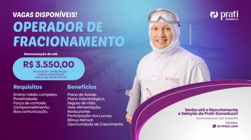 Prati-Donaduzzi abre vagas para Operador de Fracionamento