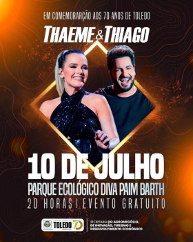 O domingo (10) de julho será animado por muita música em Toledo com um grande show da dupla Thaeme e Thiago. A realização da apresentação foi confirmada na tarde desta sexta-feira (01) pela Secretaria de Comunicação Social da Prefeitura.